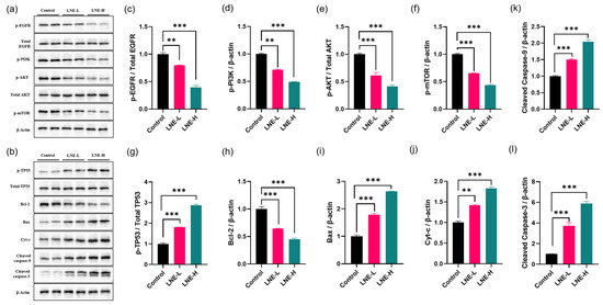 We first investigated LNE’s effect on the PI3K/AKT/mTOR signaling cascade. As shown in Figure 15a,c–f, LNE treatment caused a dose-dependent decrease in the phosphorylation of EGFR, PI3K, AKT, and mTOR. Importantly, the expression levels of total EGFR and total AKT remained constant across all groups. The quantification of the p-EGFR/total EGFR and p-AKT/total AKT ratios confirmed that LNE significantly inhibits the activation of this pathway, rather than altering total protein expression. This demonstrates that LNE effectively suppresses this critical pro-survival signaling cascade in vivo.