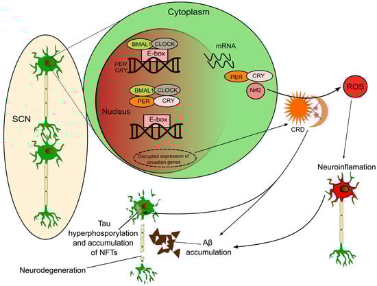 Neuronal dysfunction has also been observed in the SCN of patients with AD [,]. Similarly, signs of degeneration, including increased glia/neuron ratio in the SCN tissue of postmortem AD patients, have been detected []. Moreover, in AD patients, melatonin levels are reduced []. These changes could potentially contribute to disruptions in circadian gene expression and hence CRDs.