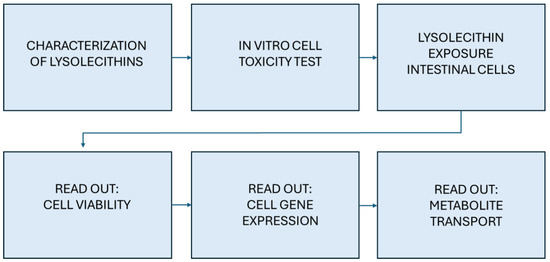 Previous research has highlighted that lysolecithins directly enhance all phases of lipid digestion and FA absorption through a multi-level, synergistic mode of action [2,3,4]; however, there are indications that they affect more pathways influencing the digestion processes and absorption of other essential nutrients, such as amino acids, which have not yet been fully explored and unraveled. In this context, a soybean lysolecithin was fully characterized and its effect on intestinal cells was studied with a polarized/Transwell cell culture setup via a triple approach. More specifically, its effects on intestinal cell viability, gene expression, and metabolite transport were screened, according to the chart presented in Figure 1. Hereby, it was clarified that the effects of the lysolecithins exceed surface chemistry; as such, lysolecithins contain compounds that seem to have very potent signaling functions. This would imply that very small amounts of the right lysolecithins can have a significant impact on the intestinal tract metabolism and nutrient transport actions. This study aims to assess whether a soybean-derived lysolecithin affects intestinal epithelial cell viability, gene expression, and metabolite transport in vitro using a triple-assay approach.