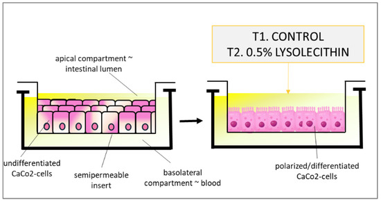 The human intestinal Caco-2 cell line was originally obtained from Prof. Alain Zweibaum (INSERM, Villejuif, France). To prepare the initial low-density (LD) cell stock, Caco-2 cells were seeded at 4.5 × 103 cells/cm2 and sub-cultured at 50% confluence (5.4 × 104 cells/cm2) for 10 passages, changing the medium every two days. A large stock of LD cells was produced and stored in liquid nitrogen (see the cell freezing protocol below), allowing all of the experiments to be performed within a range of four passages. In our experiment, Caco-2 cells were sub-cultured at low density as previously described in [31]. In vitro polarized cell culture setups (Transwell® assay; Corning, Bologne Billancourt, France) with intestinal Caco-2 cells were cultured according to standard conditions on 6-well Transwell® filters and filter-based inserts for approximately 21 days, in order to allow differentiation and polarization to confluent monolayers [31,32]. Briefly, cells were routinely sub-cultured at 50% density and were maintained at 37 °C in a 90% air–10% CO2 atmosphere in Dulbecco’s minimum essential medium (DMEM) containing 25 mM glucose, 3.7 g/L NaHCO3, 4 mM l-glutamine, 1% non-essential amino acids, 100 U/L penicillin, and 100 μg/L streptomycin (complete medium), supplemented with 10% heat-inactivated fetal bovine serum (FBS) (HyClone Laboratories, Logan, UT, USA). All reagents were obtained from Sigma unless otherwise stated. Two hours prior to exposure, the medium of the basal compartment was replaced with PBS containing Ca2+ and Mg2+ to allow for equilibration to the nutrient-depleted conditions at the serosal side of the cells. Similarly, the medium in the apical compartment was replaced with serum-free DMEM. Next, the PBS in the basal compartment was replaced with fresh PBS, and the cells were either treated or not with 0.5% (by weight per volume) lysolecithin (the soybean-derived lysolecithin source present in LYSOFORTE®) solubilized in serum-free DMEM, with 6 repeats per treatment. Before and after incubation, a quality control (QC) of the cell monolayer’s intactness was performed by measuring the transepithelial electrical resistance (TEER), using the automated REMS device. TEER is a non-invasive technique that measures the impedance between the lumen and the basolateral tissue. TEER measurements use a constant direct current applied by two electrodes: one connected with the lumen side, and the other one with the basolateral side. By applying Ohm’s law, it is possible to measure the related cell’s resistance [33]. The experimental setup is presented in Figure 2. The human intestinal Caco-2 cell line differentiates spontaneously in culture without supplementation of differentiating factors, and it has been extensively used as a model of the intestinal barrier for in vitro toxicology studies [34].