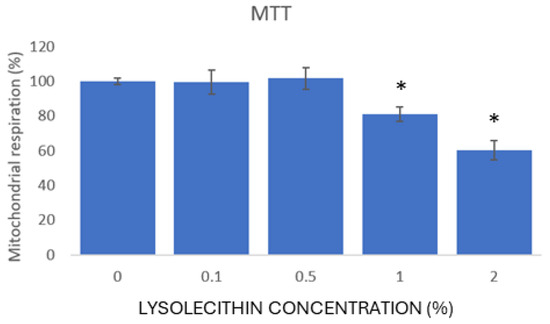 Toxicity assay data based on MTT absorbance. MTT absorbance values relative to the untreated condition; n = 12; * shows values significantly different (p < 0.05) from the untreated condition according to ANOVA. Post-hoc comparisons between treatments were carried out using Duncan’s test.