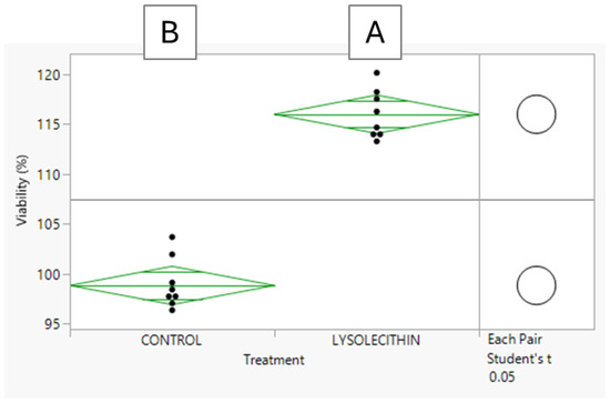 Intestinal cell viability of Caco-2 cells in response to 0.5% lysolecithin versus control; n = 12; A and B values show significant differences between treatments (p < 0.05) according to Student’s t-test.