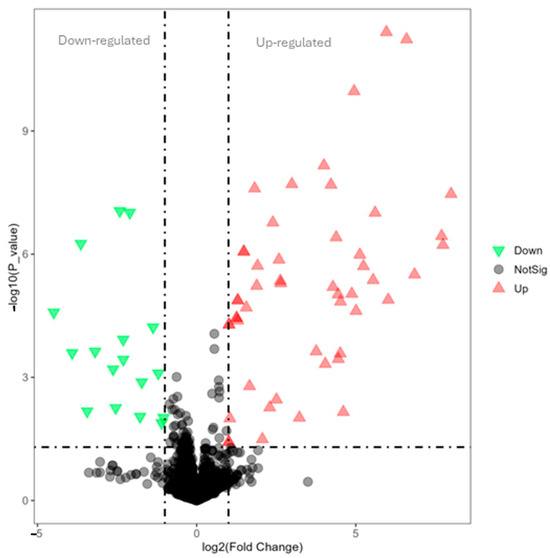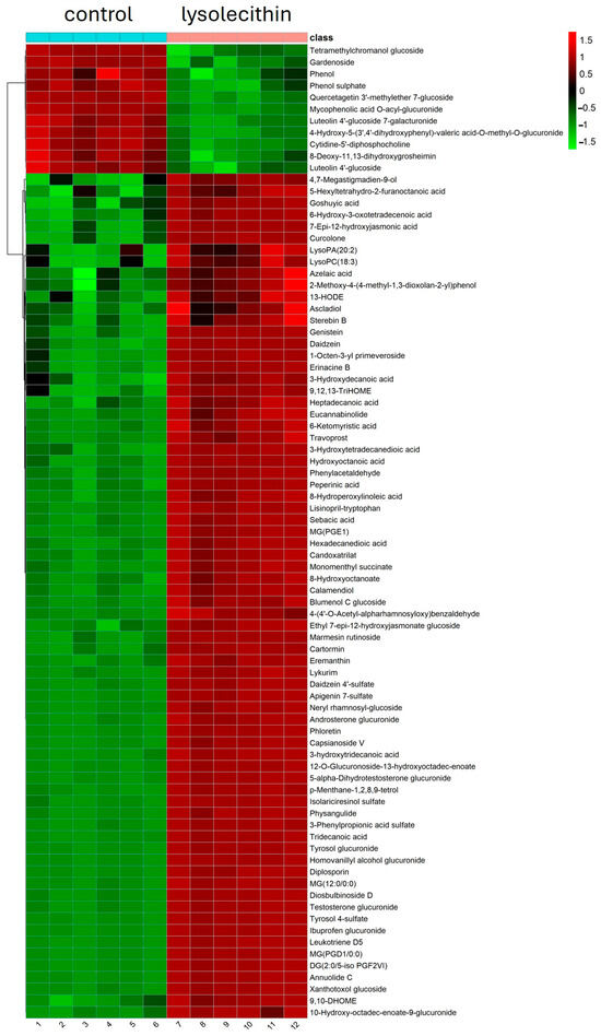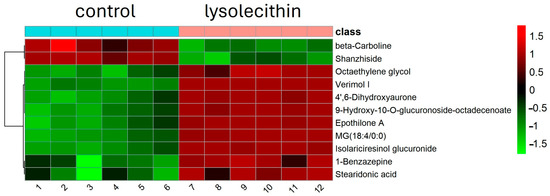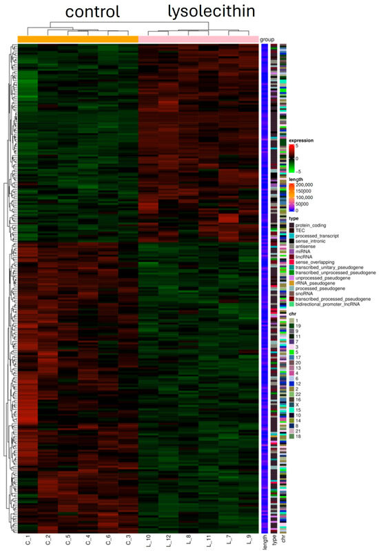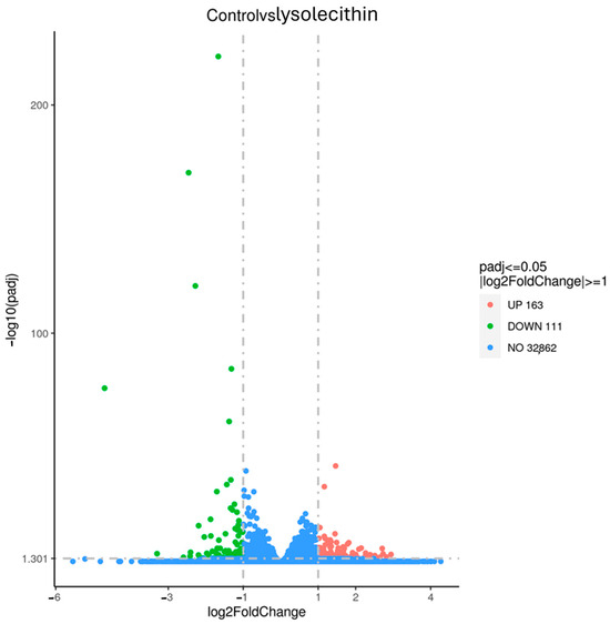 In Figure 7, the volcano plot illustrates the overall gene expression differences between lysolecithin and the control group. When comparing the control versus lysolecithin, 274 genes were differentially expressed, of which 163 were upregulated and 111 were downregulated (DESeq2 padj ≤ 0.05 |log2FoldChange| ≥ 0.0).