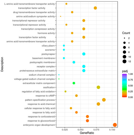 Volcano plots were used to infer the overall distribution of differentially expressed genes. For experiments with biological replicates, the threshold is normally set as padj < 0.05. Through the enrichment analysis of the differentially expressed genes, one can determine which biological functions or pathways are significantly associated with differentially expressed genes. Gene Ontology (GO, http://www.geneontology.org/, accessed on 5 May 2025) is a major bioinformatics initiative to unify the presentation of gene and gene product attributes across all species. DEGs refer to differentially expressed genes. GO enrichment analysis was used by Goseq, which is based on Wallenius’ non-central hypergeometric distribution; its characteristics are as follows: the probability of drawing an individual from a certain category is different from that of drawing it from outside of the category, and this difference can be determined by estimating the preference of gene length.