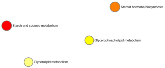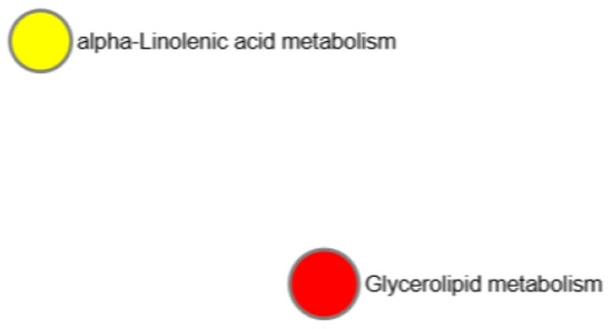 The raw data were acquired and aligned using the Compound Discoverer (3.0, Thermo), based on the m/z values and the retention time of the ion signals. Ions from both ESI− and ESI+ were merged and imported into the SIMCA-P program (version 14.1) for multivariate analysis. A principal component analysis (PCA) was first used as an unsupervised method for data visualization and outlier identification. Supervised regression modeling was then performed on the dataset via partial least squares discriminant analysis (PLS-DA) or orthogonal partial least squares discriminant analysis (OPLS-DA) to identify the potential biomarkers. The biomarkers were filtered and confirmed by combining the results of the VIP values (VIP > 1.5), t-tests (p < 0.05), and fold-change values (FC > 2). The quality of the fitting model can be explained by the R2 and Q2 values. R2 displays the variance explained in the model and indicates the quality of the fit. Q2 displays the variance in the data, indicating the model’s predictability.