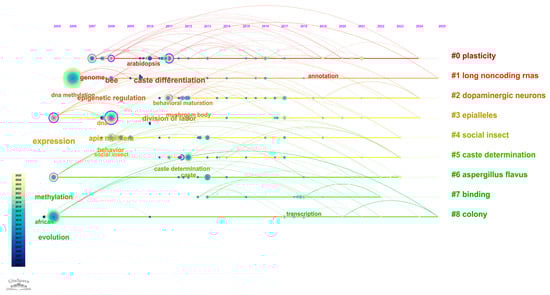 Bibliometric Analysis of Research on DNA Methylation in Honeybees. This figure presents a bibliometric mapping of research topics related to “honeybee” and “DNA methylation” based on a keyword co-occurrence analysis of publications indexed in the Web of Science database. The network illustrates the strength of associations between keywords and research themes, with node size reflecting keyword frequency and line thickness indicating co-occurrence strength. The color gradient represents the average publication year for each keyword cluster, where lighter colors denote more recent research activity. This visualization highlights evolving research trends and emerging focal points in the field of honeybee epigenetics.