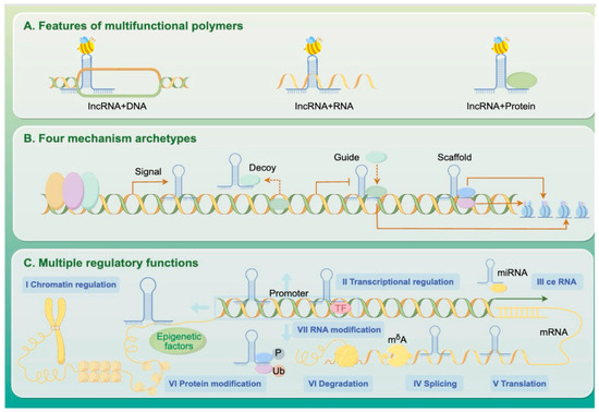 Long non-coding RNAs (lncRNAs) are transcripts longer than 200 nucleotides that do not encode proteins but play essential roles in gene regulation. These lncRNAs can bind to DNA, recruit chromatin-modifying complexes to reshape epigenetic landscapes, interact with mRNAs to influence their splicing or stability, and serve as scaffolds or decoys for regulatory proteins (Figure 2).