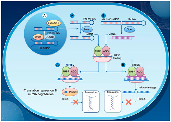 Mechanisms of Gene Regulation by siRNA and miRNA. This diagram illustrates the distinct pathways through which small interfering RNAs (siRNAs) and microRNAs (miRNAs) regulate gene expression in eukaryotic cells. (A) miRNA biogenesis begins in the nucleus, where primary miRNAs (pri-miRNAs) are processed by Drosha and its cofactor DGCR8 into precursor miRNAs (pre-miRNAs). These pre-miRNAs are then exported to the cytoplasm via Exportin-5. In the cytoplasm, Dicer processes the pre-miRNAs into mature miRNAs, which are loaded into the RNA-induced silencing complex (RISC), consisting of TRBP and AGO proteins, forming the miRISC. The miRISC typically binds to partially complementary sequences in target mRNAs, leading to translational repression and mRNA degradation. (B) siRNAs are derived from double-stranded RNA (dsRNA), Dicer-substrate siRNA (DsRNA), or short hairpin RNA (shRNA), and are processed by Dicer into short double-stranded siRNAs. These siRNAs are then incorporated into the RISC to form si-RISC, which generally binds perfectly complementary target mRNAs and induces their cleavage, thereby inhibiting protein expression.