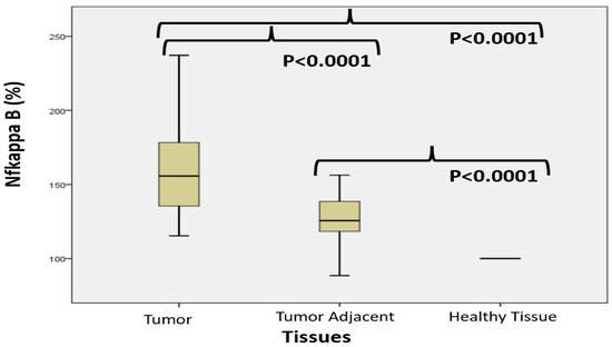 Figure 1 shows the NF-κB in colon cancer, tumor-adjacent, and healthy tissue, accordingly. The median percentage of NF-κB differed significantly among groups (Mann–Whitney test): 155.73 (115.34–251.15) in colon cancer, 125.58 (88.52–156.34) in tumor-adjacent, and 100 in healthy tissue, respectively.