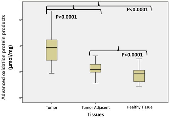 Advanced oxidation protein products (μmol/mg) in colon cancer, tumor-adjacent, and healthy tissue, accordingly.