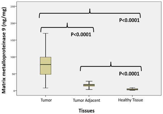 Figure 3 shows the matrix metalloproteinase 9 values (ng/mg) in colon cancer, tumor-adjacent, and healthy tissue, accordingly. The median values of MM-9 values differed significantly among groups (Mann–Whitney test) and were 77.5 (8–205) in colon cancer, 16.75 (2–32) in tumor-adjacent, and 4 (1–9) in healthy tissue, respectively.
