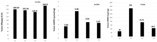 We further categorized the colon cancer samples to TNM stages as stage T1, T2, T3, and T4, according to disease severity. The values of AOPPs, MM-9, and NF-κB differed significantly among TNM stages (p = 0.001, p < 0.0001, and p = 0.011, Mann–Whitney test, respectively). The highest levels of AOPPs and MMP-9 were observed in patients at stage II of the disease, whereas patients in stage T4 exhibited the highest levels of NF-κB (Figure 4).