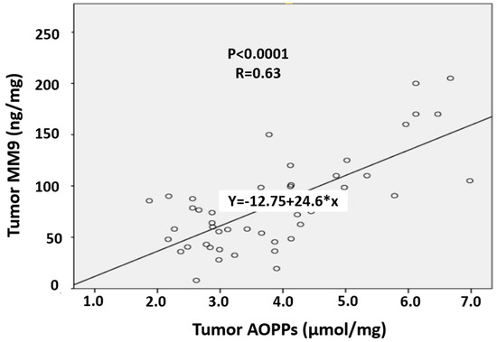 To assess the level of correlation, we performed the Spearman’s correlation test between the parameters. Tumor AOPPs were significantly correlated with tumor MMP-9 expression (p < 0.0001, r = 0.63, Figure 5). However, the association between tumor AOPPs and NF-κB marginally lost its significance (p = 0.089, r = 0.24) in the Spearman’s rho correlation matrix. There was no association between the values of AOPPs, MMP-9, and NF-κB in tumor-adjacent and healthy tissue.