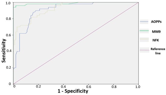 Moreover, we aimed to investigate the predictive value of these three parameters for the diagnosis of colon cancer. The evaluation of areas under the curves (AUCs) showed that all three variables (AOPPs, MM9, and NF-κB) predicted colon cancer with particularly significantly high performance (AUC = 0.912, 95% CI = 0.87–0.96, p < 0.0001 for AOPPs; AUC = 0.988 95% CI = 0.97–1.00, p < 0.0001 for MM9; AUC = 0.927 95% CI = 0.89–0.97, p < 0.0001 for NF-κB), with MM9 showing the highest predictive ability (Figure 6).