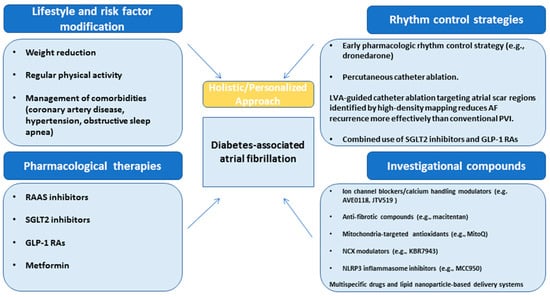 As discussed in the current review, DM creates an arrhythmogenic substrate in the atrial myocardium via multiple pathophysiological mechanisms, leading to an increased risk of developing AF []. Hence, successful rhythm control requires a rather holistic approach that also includes effective glycemic control and proper management of comorbidities (Figure 2). It is known that DM often coexists with other known risk factors that promote the onset of AF, such as hypertension, coronary artery disease, obstructive sleep apnea, and obesity, all of which must be carefully managed through appropriate pharmacotherapy and lifestyle modifications in order to achieve rhythm control [].