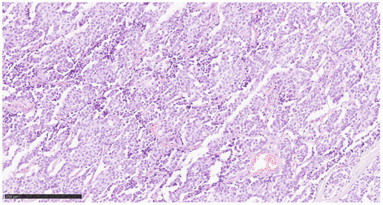 Tumour tissue was obtained from a histologically confirmed medullary thyroid carcinoma (MTC) at three anatomical sites: the primary tumour, a LNM, and a DM in the liver. The Cancer Hotspot Panel was applied to DNA material derived from formalin-fixed and paraffin-embedded (FFPE) tumour material (haematoxylin-eosin staining of primary tumour, 4 μm; Figure 1). The FFPE blocks containing the largest available tumour mass from the patient was selected for analysis. The initial diagnosis was made following the detection of a liver metastasis of unknown primary origin. Subsequent staging revealed a primary tumour in the thyroid gland accompanied by cervical LNM. A palliative thyroidectomy and cervical lymphadenectomy were performed to achieve local disease control, and histopathological confirmation of cervical LNM was obtained. Due to the advanced stage of disease and the patient’s poor general condition, systemic therapy could not be initiated. The patient was diagnosed with sporadic MTC. Genetic counselling was conducted, and multiple endocrine neoplasia (MEN) syndrome, as well as hereditary MTC, were excluded.