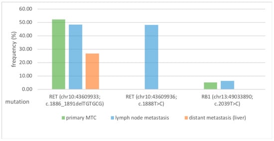 In summary of the analysis of the primary tumour vs. LNM, the evaluation of the mutation classified as reliably pathogenic (RET gene (chr10:43609933, c.1886_1891delTGTGCG; RB1 gene, chr13:49033890, c.2039T>C) shows a match between primary tumour tissue and LNM. Nevertheless, the RET gene mutation (chr10:43609933, c.1886_1891delTGTGCG) was clearly more frequently detectable and can, therefore, be proven to be homogenous (Table 1, Figure 2).