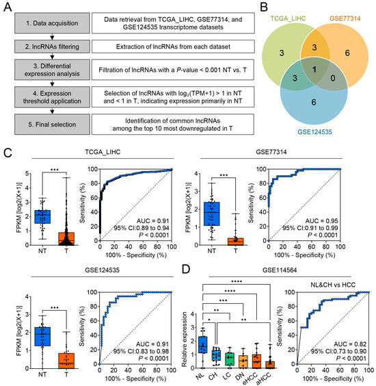 Integrative Analysis of Differentially Expressed lncRNAs in HCC Across Multiple Datasets. (A) Flow diagram detailing the methodology used to identify differentially expressed lncRNAs in HCC. (B) Venn diagram illustrating the overlap of significantly differentially expressed lncRNAs across the TCGA_LIHC, GSE77314, and GSE124535 datasets. (C) Box plots (left bar plot of the each dataset) showing the expression levels of CTC-537E7.3 in tumor (T) and non-tumor (NT) liver tissues across TCGA_LIHC, GSE77314, and GSE124535 datasets, demonstrating its significantly downregulation in HCC compared to NT. Receiver operating characteristic (ROC) curves (right ROC curve plot of the each dataset) demonstrate the diagnostic performance of CTC-537E7.3 in distinguishing HCC from non-tumor liver tissues, presenting area under the curve (AUC) values, 95% confidence intervals (CIs), and statistical significance (p-values). (D) Expression levels of CTC-537E7.3 across different stages of liver disease and cancer progression, including normal liver (NL), chronic hepatitis (CH), liver cirrhosis (LC), dysplastic nodules (DN), early HCC (eHCC), and advanced HCC (aHCC), based on the GSE114564 dataset (left panel). The Y-axis represents the expression levels of CTC-537E7.3, while the X-axis denotes different sample groups. Statistical significance between groups is indicated by asterisks (* p < 0.05, ** p < 0.01, *** p < 0.001, **** p < 0.0001).