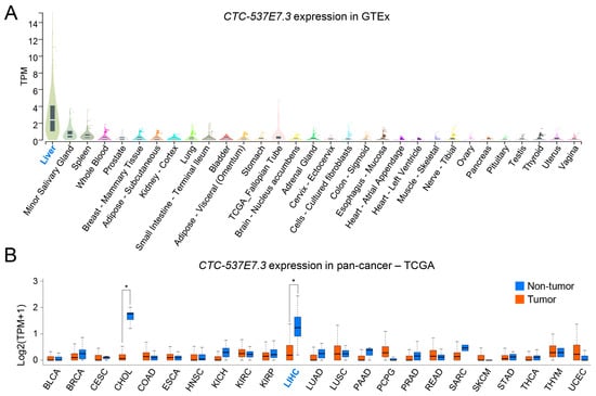 CTC-537E7.3 Expression in Normal and Cancerous Tissues. (A) CTC-537E7.3 expression across various normal human tissues from the GTEx dataset. The Y-axis represents log2(TPM + 1). (B) Pan-cancer analysis of CTC-537E7.3 expression across 23 cancer types using TCGA data. Significant differences in expression between tumor (tumor, red box) and normal adjacent tissues (non-tumor, blue box) are highlighted for hepatocellular carcinoma (LIHC) and cholangiocarcinoma (CHOL). BLCA, bladder urothelial carcinoma; BRCA, breast invasive carcinoma; CESC, cervical squamous cell carcinoma and endocervical adenocarcinoma; COAD, colon adenocarcinoma; ESCA, esophageal carcinoma; HNSC, head and neck squamous cell carcinoma; KICH, kidney chromophobe; KIRC, kidney renal clear cell carcinoma; KIRP, kidney renal papillary cell carcinoma; LUAD, lung adenocarcinoma; LUSC, lung squamous cell carcinoma; PAAD, pancreatic adenocarcinoma; PCPG, pheochromocytoma and paraganglioma; PRAD, prostate adenocarcinoma; READ, rectum adenocarcinoma; SARC, sarcoma; SKCM, skin cutaneous melanoma; STAD, stomach adenocarcinoma; THCA, thyroid carcinoma; THYM, thymoma; UCEC, uterine corpus endometrial carcinoma. * p < 0.05.