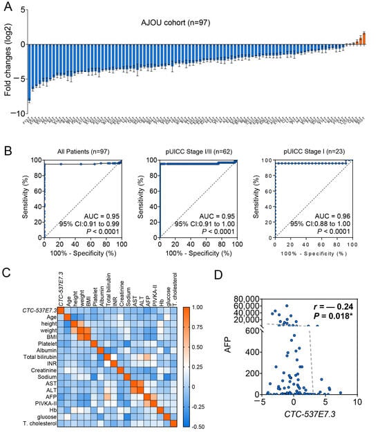 Given the pronounced tissue specificity and consistent downregulation in HCC, the diagnostic utility of CTC-537E7.3 was evaluated in a clinical cohort. qRT-PCR analysis was conducted using 97 matched pairs of T and NT liver tissue samples. A significant reduction in CTC-537E7.3 expression was observed in 91 of the 97 cases (95%) (*** p <0.0001), confirming its recurrent loss in T tissues (Figure 4A). ROC curve analysis conducted to further assess the diagnostic performance of CTC-537E7.3 demonstrated its strong ability to distinguish HCC from NT tissues, yielding an AUC of 0.95 (95% CI: 0.91–0.99, *** p < 0.0001). Notably, CTC-537E7.3 retained this diagnostic power even for the detection of early-stage HCC, achieving AUCs of 0.95 (95% CI: 0.91–1.00, *** p < 0.0001) and 0.96 (95% CI: 0.88–1.00, *** p < 0.0001) in patients with pUICC stage I/II disease (n = 62) and those with pUICC stage I disease (n = 23), respectively (Figure 4B). These findings are consistent with those of previous ROC analyses conducted using the TCGA_LIHC, GSE77314, and GSE124535 datasets, reinforcing the robustness of CTC-537E7.3 as a diagnostic biomarker across independent cohorts. A correlation heatmap analysis was conducted to examine the association between CTC-537E7.3 expression and various clinical parameters to determine its clinical relevance (Figure 4C). The heatmap revealed a general trend of negative correlation, with the darker blue shading indicating a stronger negative association. Notably, CTC-537E7.3 expression exhibited a statistically significant correlation with serum AFP levels only (r = −0.24, * p = 0.018). The levels of AFP, a widely used biomarker for HCC, increase in response to liver damage and are particularly elevated in patients with HCC. However, given the limitations of AFP as a stand-alone diagnostic marker, the findings of the present study suggest that CTC-537E7.3 may serve as a complementary biomarker to enhance the accuracy of the diagnosis of HCC and improve patient stratification (Figure 4D). The combination of CTC-537E7.3 and AFP may represent an improved strategy for the detection of early-stage HCC and more precise disease classification.