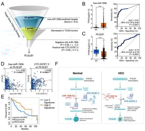The CTC-537E7.3–miR-190b-5p–PLGLB1 ceRNA Axis in HCC. (A) Funnel diagram illustrating the step-wise screening strategy used to identify key components of the ceRNA axis. The process filtered miR-190b-5p targets from miRDB, selected for genes with tumor-specific downregulation, and identified PLGLB1 as the single gene showing an inverse correlation with miR-190b-5p and a positive correlation with CTC-537E7.3 in the TCGA_LIHC dataset. (B) Box plot (left) comparing miR-190b-5p expression in non-tumor (NT) and tumor (T) liver tissues, and a receiver operating characteristic (ROC) curve (right) demonstrating its diagnostic performance. (C) Box plot (left) showing PLGLB1 expression in NT versus T tissues, with a corresponding ROC curve (right) illustrating its diagnostic accuracy. For both (B,C), area under the curve (AUC), 95% confidence intervals (CIs), and p-values are provided. (D) Pearson correlation analysis showing the inverse relationship between miR-190b-5p and PLGLB1 (left), and the positive relationship between CTC-537E7.3 and PLGLB1 (right). Correlation coefficients (r) and p-values are indicated. (E) Kaplan–Meier overall survival analysis based on combined expression signatures. Patients were stratified into a concordant low-expression group (concurrent low expression of both CTC-537E7.3 and PLGLB1) and a concordant high-expression group (concurrent high expression of both transcripts). Hazard ratio (HR), 95% CI, and the log-rank p-value are presented. (F) Schematic model of the proposed mechanism. In normal hepatocytes (left), CTC-537E7.3 sponges miR-190b-5p, allowing PLGLB1 translation. In HCC (right), reduced CTC-537E7.3 levels lead to increased miR-190b-5p activity, resulting in the repression and degradation of PLGLB1. Statistical significance between groups is indicated by asterisks (*** p < 0.001).