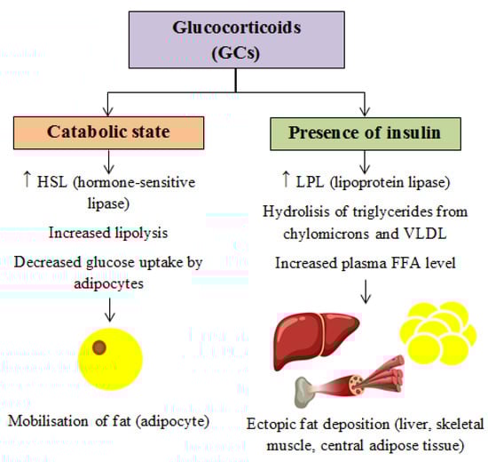 The overall effect of GCs on fat storage is context-dependent, influenced by the metabolic state (Figure 1). Under catabolic conditions, GCs upregulate hormone-sensitive lipase (HSL), promoting lipolysis in adipose tissue and reducing glucose uptake by adipocytes. In contrast, under insulin-rich conditions, GCs enhance lipoprotein lipase (LPL) expression, increasing the hydrolysis of circulating triglycerides from chylomicrons and VLDL. This elevates plasma FFA levels, leading to ectopic fat deposition in the liver, muscle, and central adipose tissue [,].