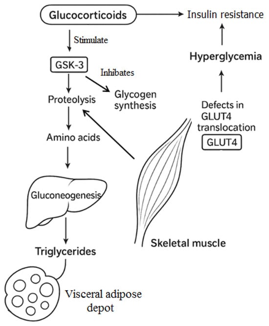 GCs regulate insulin action in a tissue-specific manner, enhancing insulin sensitivity in subcutaneous adipose tissue under certain conditions, while impairing it in skeletal muscle. This increased insulin responsiveness in adipose tissue, due to the upregulation of lipogenic enzymes, may promote adipocyte expansion and contribute to the development of obesity. In contrast, the reduction in insulin efficacy observed in skeletal muscle appears to result from the GC-mediated inhibition of key intermediary signaling pathways between the insulin receptor and glucose transport activation. Defects in GLUT4 translocation and post-translational modifications that impair the functional capacity of glucose transporter units play an important role []. Furthermore, cortisol activates glycogen synthase kinase-3 (GSK-3), a kinase that suppresses glycogen synthesis and promotes protein degradation []. Excess glucocorticoids stimulate skeletal muscle protein breakdown, leading to muscle atrophy. The released amino acids are utilized by the liver for gluconeogenesis, contributing to elevated blood glucose levels (Figure 3). Part of this glucose load is subsequently converted into fatty acids and stored as triglycerides, particularly in visceral adipose depots [].