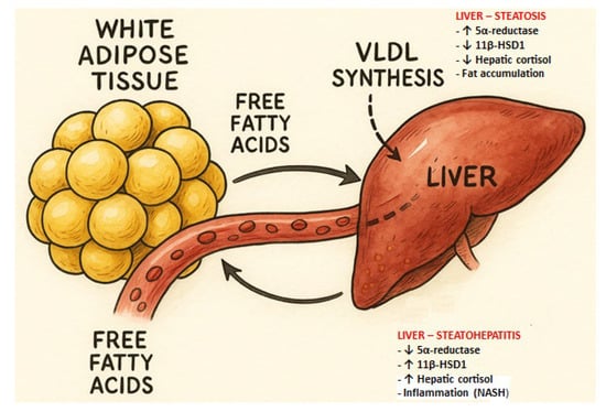 Experimental studies have shown that the overexpression of 11β-HSD1 exacerbates hepatic steatosis [], while the pharmacological inhibition of this enzyme improves insulin sensitivity and reduces the hepatic triglyceride content. Similarly, impaired 5α-reductase activity has been associated with worsened steatosis [].