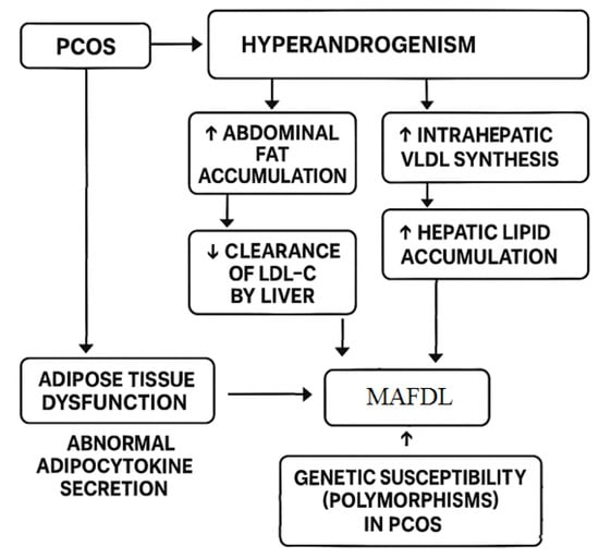 Several genetic polymorphisms have been implicated in both PCOS and MASLD. These include the LDLR gene (affecting LDL receptor expression in hepatocytes), the PNPLA3 gene (encoding a protein strongly linked to hepatic fat accumulation), and the FTO gene (associated with obesity and altered adipose tissue biology). However, in women with PCOS, metabolic factors outweigh PNPLA3 polymorphism in determining NAFLD risk, though both can synergistically increase disease severity [].