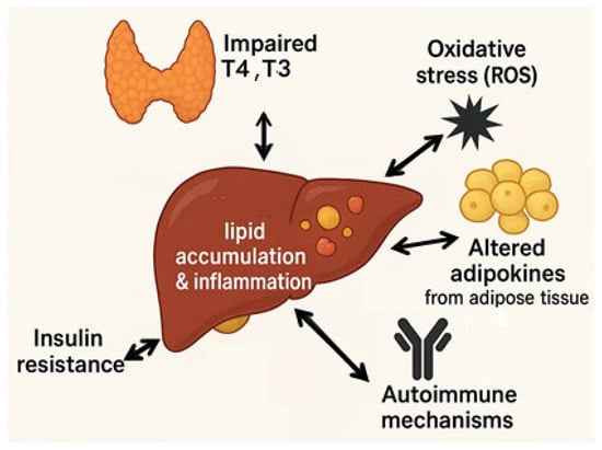 Hypothyroidism, both overt and subclinical, is associated with a higher risk of MASLD due to impaired lipid metabolism and liver fat buildup, with the risk especially elevated in younger individuals and men [].
