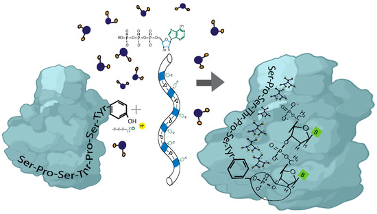 Protein kinase enzymes catalyze the transphosphorylation of OH-containing substrates by converting ATP to adenosine diphosphate (ADP), a process facilitated by a divalent cation (typically Mg2+) in a substitution reaction centered around phosphorus [36]. CTD Pol II is flexible and highly disordered. Most phosphorylation sites in proteins are located in their disordered or dynamic regions. Tyr phosphorylation has emerged as a key theme in cellular regulation, primarily due to the finding that activating a Tyr kinase is the initial event in many signaling pathways. The oncogenes of various retroviruses encode Tyr kinases, which promote unregulated Tyr kinase activities that transform cells [31,37,38]. The effects of Tyr kinases are partly mediated through a substantial quantitative increase in the phosphorylation of aliphatic hydroxy-amino acids such as Ser and Thr [36]. Tyr kinases indirectly activate Ser/Thr kinases through phospholipid-derived second messengers [31]. This may explain why Tyr-phosphorylated proteins remain a small minority.