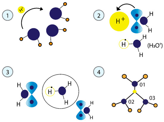The process of forming the tetrahedral structure of water. (1) The released proton (H+) functions as a free particle. (2) The kinetic energy generates the H3O+ cation from one water molecule. (3) H3O+ is highly reactive and is quickly solvated by neighboring water molecules. (4) The H3O+ ion, linked by a bifurcated H-bond to two adjacent water molecules, represents the minimum energy structure.