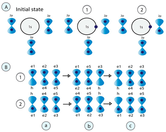 In Figure 4A, we explain the process of superconducting water based on these same principles. When the H3O+ cation is formed, the kinetic energy of the H+ proton attracts an electron from a lone pair located in a free orbital of an oxygen (O1) atom to the empty orbital, leaving a hole. The displacement of this electron then releases energy and leaves a hole in its position. This is now used by another electron located in the orbital of the second oxygen (O2) to move to the new hole left.
