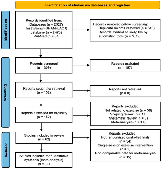 A total of 2531 records were initially identified through database searches, including 2470 from the institutional UNAM-UACJ databases and 57 from PubMed. After removing 543 duplicates and excluding 1675 records flagged as ineligible by automated tools, 309 records were screened based on their titles and abstracts. Of these, 157 did not meet the inclusion criteria and were excluded. The remaining 152 full-text articles were retrieved and assessed for eligibility, with none excluded due to unavailability. After full-text screening, 90 reports were excluded for the following reasons: not related to exercise (n = 59), scoping reviews (n = 17), systematic reviews (n = 3), and meta-analyses (n = 11). A total of 66 studies were included in the review. From this set, 34 studies were excluded because they were not RCTs, along with 5 involving single-session exercise interventions and 12 with non-comparable data for meta-analysis, leading to a final selection of 11 studies for the meta-analysis (Figure 1). The selected manuscripts were fully reviewed, and data were extracted to evaluate the effects of exercise protocols on sleep quality (Table 1), insomnia (Table 2), and inflammatory markers, specifically IL-6 (Table 3) and TNF-α (Table 4).