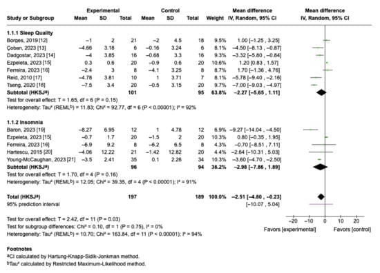 When PSQI and ISI outcomes were combined, the overall effect favored aerobic exercise, with a statistically significant pooled mean difference of −2.51 (95% CI: −4.80 to −0.23; p = 0.03). This finding supports the beneficial role of aerobic exercise in improving sleep-related parameters. However, the 95% prediction interval (−10.07 to 5.04) indicates that future studies may observe variable effects depending on sample characteristics and intervention specifics. The test for subgroup differences was not significant (Chi2 = 0.10, p = 0.75), suggesting consistency of the exercise effect across different types of sleep outcomes.