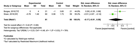 The pooled analysis of Borges et al. (2019) [12] and Sloan et al. (2018) [22] revealed a standardized mean difference (SMD) of −0.17; (95% CI: −0.91, 0.58; p = 0.66), indicating a small, non-significant reduction in IL-6 concentrations among individuals in the exercise group compared with controls. Notably, the direction of the effect differed between the two studies. Sloan et al. (2018) [22], which included healthy young adults undergoing progressive aerobic training, reported a greater reduction in IL-6 (SMD = −0.51), while Borges et al. (2019) [12], which involved participants with obstructive sleep apnea and a shorter intervention period, showed a slight increase (SMD = 0.26). Only one of the two studies reported a decrease in IL-6 concentrations after exercise. However, the small sample size (n = 81) and the high heterogeneity among the studies (I2 = 78%, p = 0.03), prevent definitive conclusions.