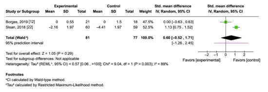 A closer examination of individual results reveals significant discrepancies between studies. Sloan et al. (2018) [22] reported a greater reduction in TNF-α within the control group, whereas Borges et al. (2019) [12] observed no meaningful difference between groups. These divergent outcomes may be explained by differences in sample characteristics, intervention design, and timing of post-intervention measurements.