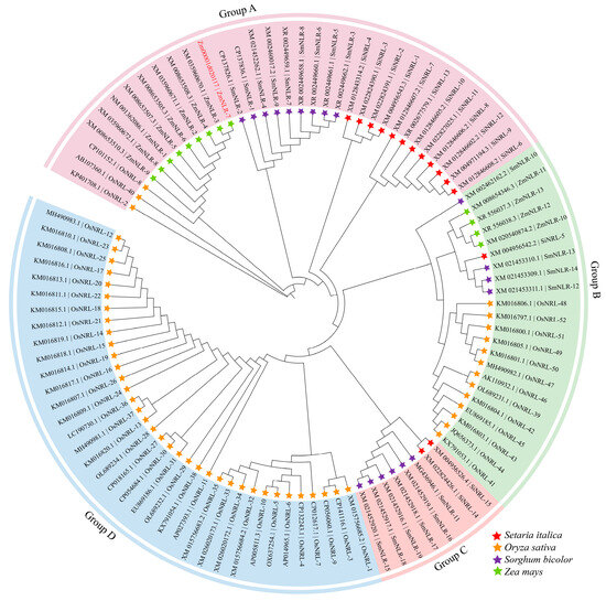 Phylogenetic analysis of ZmNLR-7 from Triticum aestivum, Oryza sativa, and Zea mays. The genes encoding the ZmNLR-7 were divided into 4 categories. ZmNLR-7 was marked in red. The species we selected—Setaria italica, Oryza sativa, Sorghum bicolor, and Zea mays—are all monocotyledonous plants. Bootstrap values of 1000 replicates are shown as percentages at the branch nodes. Bar = 0.1. The protein-naming method in the figure consisted of autonomously naming with an NCBI number.