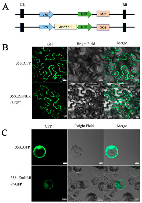 Subcellular localization analysis of ZmNLR-7. (A) Schematic representation of the 35S::ZmNLR-7-GFP vector construction for subcellular localization analysis. (B) Subcellular localization of ZmNLR-7-GFP in Nicotiana benthamiana leaves; 35S::GFP (empty vector) served as the control. (C) Subcellular localization of ZmNLR-7-GFP in maize mesophyll protoplasts. Scale bar: 20 μm, GFP is a green fluorescent protein.