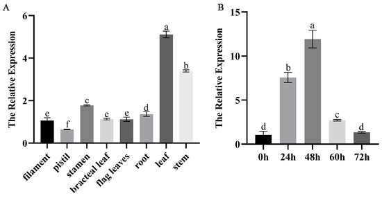 In order to explore the expression of the ZmNLR-7 gene in different tissues of maize, RT-PCR detection revealed that ZmNLR-7 was expressed to varying degrees in different tissues of maize, showing significant differences (Figure 3A). ZmNLR-7 had the highest expression level in leaves, while the expression level was significantly reduced in roots, stems, stamens, female ears, filaments, bracts, and flag leaves. In order to analyze the dynamic regulatory characteristics of ZmNLR-7 in disease-resistance response, its induced expression pattern was further analyzed by the infection experiment of Bipolaris maydis. The temporal expression analysis of 0–72 h after pathogen infection showed that the transcription level of ZmNLR-7 showed a typical time-dependent response: the expression level reached a peak 48 h after infection, which was significantly upregulated by 11.92 times compared with the untreated state (0 h), and then gradually decreased (Figure 3B).