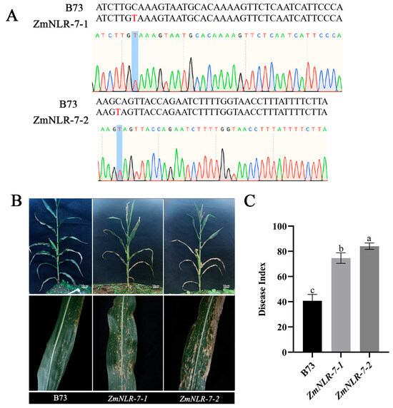To verify the genetic stability of ZmNLR-7-related EMS mutant lines, this study systematically identified the mutation sites. Using maize B73 wild type and ZmNLR-7-1 and ZmNLR-7-2 mutants as materials, leaf tissues were collected at the four-leaf stage to extract genomic DNA. According to the EMS chemical mutagenesis characteristics of the ZmNLR-7 gene, specific primers were designed in the 350 bp region upstream and downstream of the mutation site (amplification product 700 bp). After PCR amplification and Sanger sequencing analysis (Figure 4A), ZmNLR-7-1 and ZmNLR-7-2 had a C→T single base substitution at ChrX:93,688,474 and ChrX:93,694,948, respectively (see Table S1). Both ZmNLR-7-1 (EMS4-097d06) and ZmNLR-7-2 (EMS4-097d0c) lines harbor premature termination codons. Subsequent experiments utilized homozygous EMS mutant lines, and the homozygous mutant lines obtained were used for subsequent studies. Field experiments showed that the ZmNLR-7 mutant exhibited significant growth and development defects: compared with the wild-type B73, the plant height decreased by 11.21–11.33%, and the thousand-grain weight decreased by about 3.7% (Figure S2). To evaluate the disease resistance in the adult stage, a standardized field design (plant spacing of 40 cm) was carried out on the T3 generation homozygous mutant and the wild type at the experimental base of Anhui Agricultural University. The leaves were inoculated with 1 × 105 CFU/mL conidia suspension of Bipolaris maydis (Bipolaris maydis) at the tasseling stage (n = 15). Seven days after inoculation, the mutant showed a typical disease phenotype: large areas of confluent necrotic spots appeared on the leaves (Figure 4B), and the disease index reached 74.63–84.07, which was significantly higher than that of the wild type (40.74) by 33.89–43.33 (Figure 4C). Further validation through Bipolaris maydis inoculation experiments on seedling-stage maize revealed that ZmNLR-7 mutant lines (ZmNLR-7-1 and ZmNLR-7-2) also exhibited significantly enhanced disease-susceptibility phenotypes (Figure S3), consistent with field observations. The results showed that the loss of ZmNLR-7 function led to a significant reduction in the resistance of corn to Bipolaris maydis.