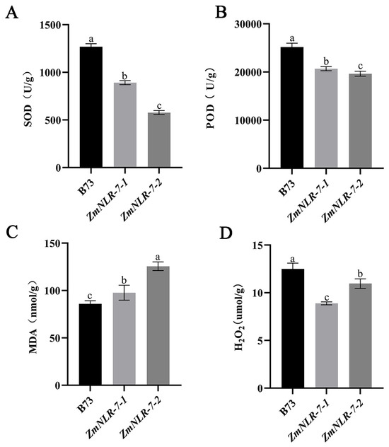The relevant physiological indicators of mutants and wild-type plants were determined 48 h after inoculation with Bipolaris maydis spore suspension. It was found that the SOD activity of ZmNLR-7-1 and ZmNLR-7-2 (891.829 U/g and 577.263 U/g) was 30–55% lower than that of wild-type B73 (1269.42 U/g) (Figure 5A), and the POD activity of mutants (20,690 U/g and 19,640 U/g) was 18–22% lower than that of wild-type B73 (25,190 U/g) (Figure 5B). At the same time, the MDA content in the mutant (97.674 nmol/g and 125.597 nmol/g) was 14–46% higher than that in the wild type (85.936 nmol/g) (Figure 5C), indicating that the membrane lipid peroxidation damage was aggravated. The H2O2 accumulation of the wild type exceeded that of the mutant, which was 12.51 μmol/g, 8.89 μmol/g, and 10.97 μmol/g, respectively (Figure 5D), revealing that its ROS scavenging ability was impaired. The results showed that the corn ZmNLR-7 mutant showed significant antioxidant system disorders after infection with Bipolaris maydis.
