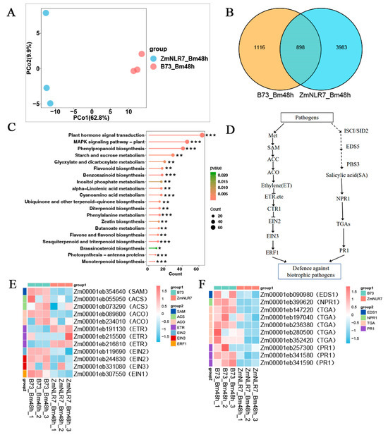 Differential gene expression in maize following Bipolaris maydis infection. (A) Principal component analysis (PCA) of global transcriptomic profiles across treatments. (B) Venn diagram illustrating shared and unique differentially expressed genes (DEGs) among experimental groups (C) KEGG pathway enrichment analysis of DEGs in wild type (B73-Bm48 h) versus ZmNLR-7 mutant (ZmNLR-7-Bm48h) at 48 h post-inoculation with Bipolaris maydis. Asterisks indicate significant differences (*: p < 0.05; **: p < 0.01; ***: p < 0.001) (D–F) Schematic representation of ethylene (ET) and salicylic acid (SA) signaling pathways, with heatmaps showing expression levels of key genes regulated by ZmNLR-7 in response to pathogen infection.