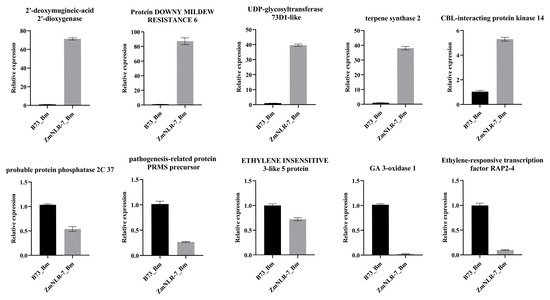To verify the authenticity of the transcriptome data, this study randomly screened several differentially expressed genes from the transcriptome data for verification, including Zm00001eb310440 (2′-deoxymugineic-acid 2′-dioxygenase), Zm00001eb137930 (Protein DOWNY MILDEW RESISTANCE 6), Zm00001eb042870 (UDP-glycosyltransferase 73D1-like), Zm00001eb230410 (terpene synthase 2), Zm00001eb350770 (CBL-interacting protein kinase 14), Zm00001eb419870 (probable protein phosphatase 2C 37), Zm00001eb341580 (pathogenesis-related protein PRMS precursor), Zm00001eb244830 (ETHYLENE INSENSITIVE 3-like 5 protein), Zm00001eb122500 (GA 3-oxidase 1), and Zm00001eb401290 (ethylene-responsive transcription factor RAP2-4). The experimental results showed that although there were certain differences in expression changes compared with RNA-seq gene expression data, the expression trends of these genes remained highly consistent as a whole (Figure 7), which fully demonstrated the authenticity and reliability of the transcriptome data of this study.
