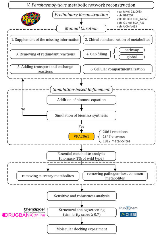 The metabolic network model was reconstructed following a standard workflow for reconstructing the GSMN [14,24]. The experimental design of this study is outlined in Figure 1. The reconstruction of the GSMN consists of three main stages: preliminary reconstruction, manual curation, and simulation-based refinement. In the preliminary reconstruction, metabolic data for five V. parahaemolyticus subtypes were retrieved from the Kyoto Encyclopedia of Genes and Genomes (KEGG) database [25]. The manual curation phase aimed to enhance the completeness and accuracy of the model. This included supplement of the missing information, chiral standardization of metabolites, removal of redundant reactions, performing gap filling at pathway and global levels, adding transport and exchange reactions, and cellular compartmentalization. Subsequently, simulation-based refinement was conducted to assess the capability of biomass synthesis. Additional biomass reactions were incorporated and simulation-based refinement was executed iteratively until the biomass synthesis was corrected simulated. The reconstructed VPA2061 was then used to analyze the essential metabolites, which were subsequently screened through removing currency metabolites and common pathogen–host metabolites to identify the potential drug targets. Finally, structural analog screening of the potential drug targets was performed using ChemSpider, PubChem, ChEBI, and DrugBank to explore potential compounds for drug design. The molecular docking experiment was conducted to evaluate the predicted structural analogs.