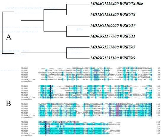 Protein sequence analysis and evolutionary relationship analysis of WRKY69 and its homologous genes in apple. (A). Phylogenetic analysis (B). Protein sequence analysis.
