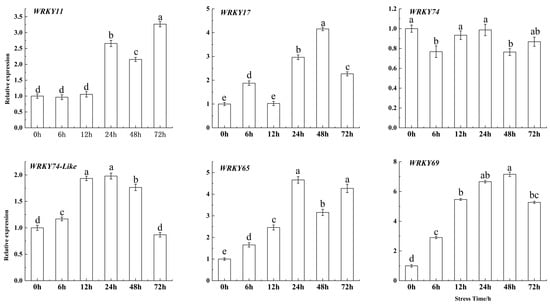 Expression levels of the WRKY69 and its homologous gene in M. domestica seedlings were measured under Fe deficiency stress at 0, 6, 12, 24, 48, and 72 h. Note: error bars denote the SD of three replicates. Different letters above the bars indicated significant differences (p < 0.05) as assessed by one-way ANOVA and the least significant difference (LSD) test. The same below.