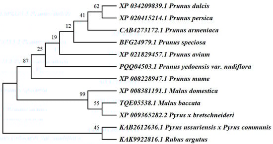 A comparison of the amino acid sequences of apple WRKY69 proteins and their WRKY homologues from various species was conducted using the NCBI database in conjunction with DNAMAN software (Figure 3). It was observed that the C-terminal regions of WRKY69 proteins, as well as those from other species, exhibited some degree of variation; however, they typically contained a C2H2 zinc finger motif. At the N-terminus, a highly conserved heptapeptide sequence, WRKYGQK, indicates the presence of the WRKY structural domain. This finding suggests that WRKY69 proteins, along with the majority of their homologues, are classified within the second class of WRKY transcription factors. Using the MEGAX (v11.0.13) software to construct evolutionary trees, the results of the phylogenetic analysis indicate that M. domestica (XP_008381191.1) clusters with Malus baccata (TQE05538.1) and Pyrus × bretschneideri (XP_009365282.2) within the same subgroup. These findings suggest that the WRKY69 gene in M. domestica is most closely related to those in Malus baccata and Pyrus × bretschneideri, implying that it may share analogous biological functions (Figure 4).