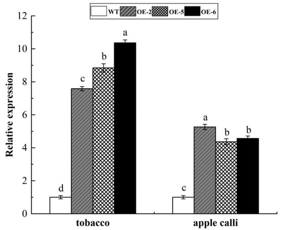 Expression level of WRKY69 TF in three transgenic tobacco and apple calli lines. Note: different letters above the bars indicated significant differences (p < 0.05) as assessed by one-way ANOVA and the least significant difference (LSD) test.