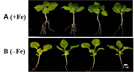 Growth and development in plants can be influenced by a variety of abiotic factors, including drought conditions in the soil, saline–alkali stress, and nutrient imbalances [,]. Fe deficiency is prevalent in plants globally and leads to various issues, such as the inability to synthesize chlorophyll, damage to organelles, and leaf chlorosis [,]. Furthermore, it disrupts photosynthesis [,], impacts plant growth and development, and significantly limits both the quality and quantity of fruit yield [,].